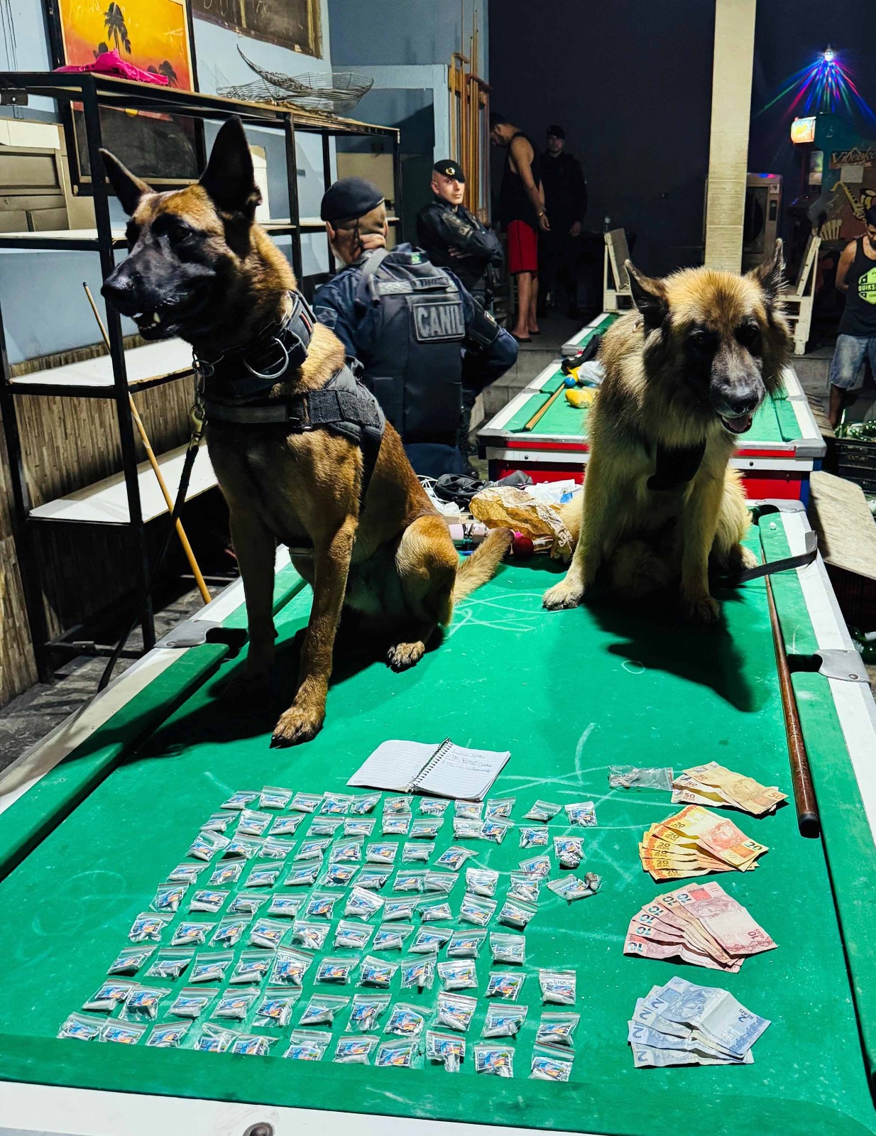 As equipes do Canil e da Coordenadoria Operacional, em atendimento a uma denúncia de perturbação do sossego e possível tráfico de drogas, flagraram as ilicitudes no estabelecimento. No flagrante, os criminosos tentaram esconder uma sacola contendo 98 porções de cocaína e R$ 338,00 em dinheiro.