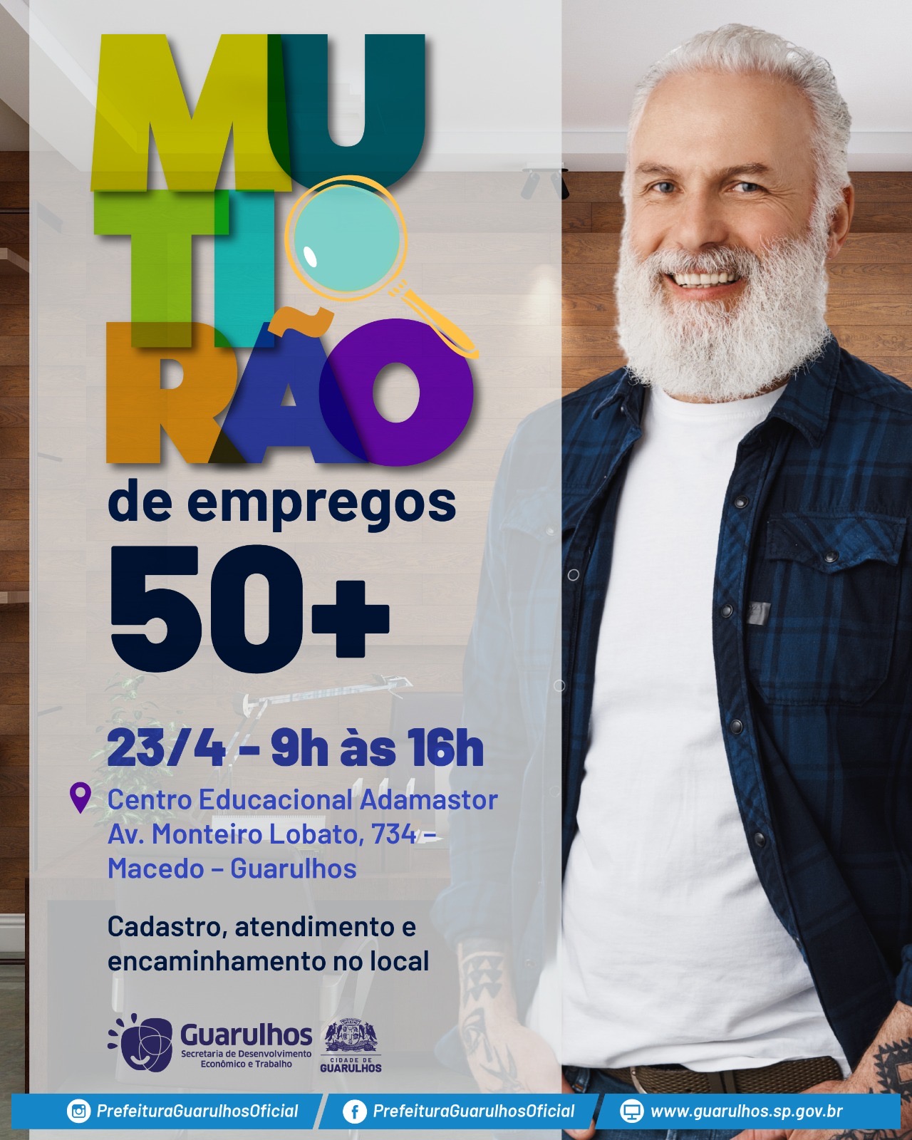 Como forma de combate ao etarismo, a Prefeitura de Guarulhos, por meio da Secretaria de Desenvolvimento Econômico e Trabalho (SDET), realiza nesta quinta-feira, dia 23, das 9h às 16h, o mutirão de empregos 50+, iniciativa voltada exclusivamente para pessoas que buscam recolocação profissional, que tenham 50 anos de idade ou mais.