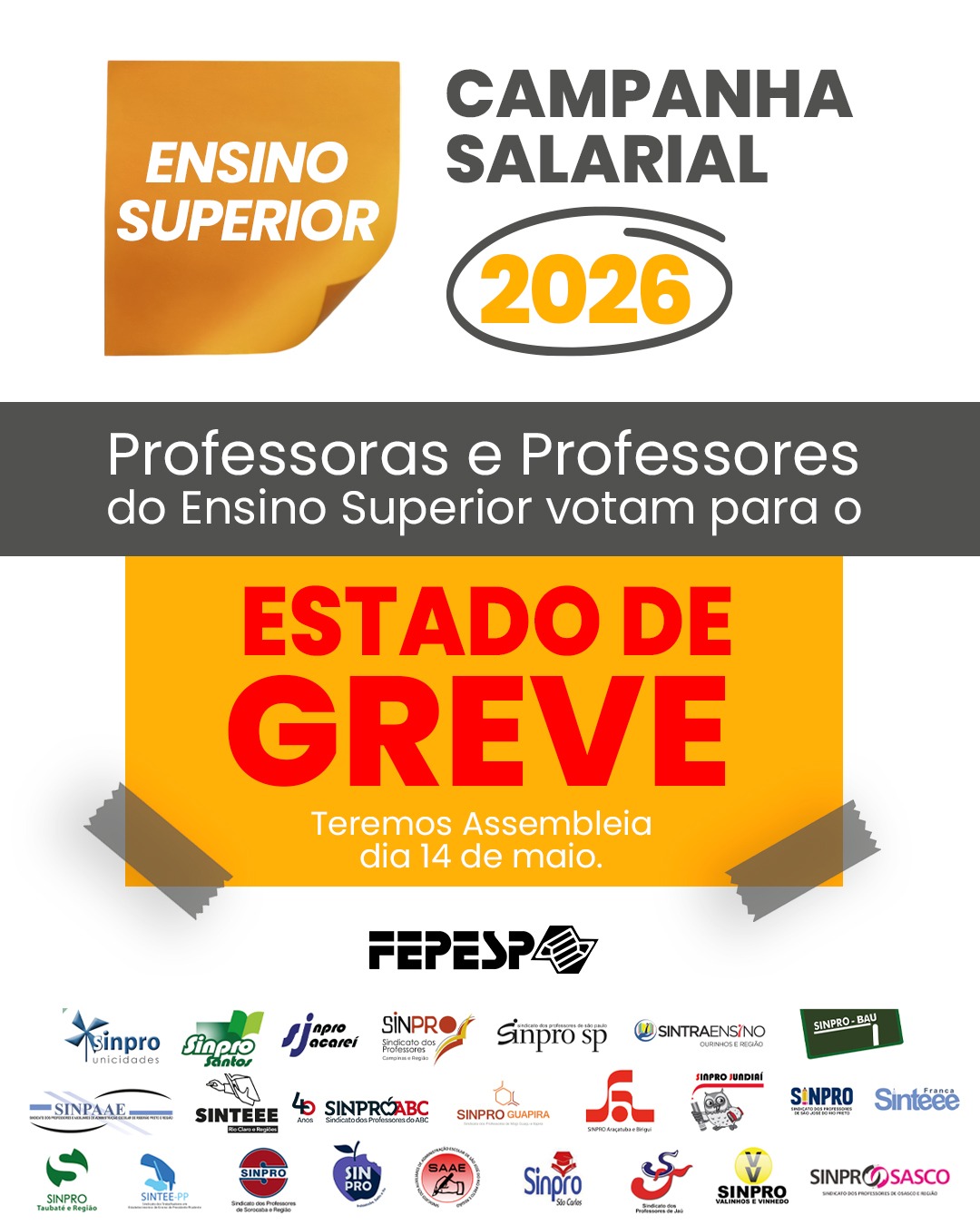 Professores e professoras do ensino superior privado no estado de São Paulo, reunidos em assembleia estadual convocada pela Federação dos Professores do Estado de São Paulo (Fepesp) e seus sindicatos filiados, rejeitaram proposta apresentada pelo Sindicato das Mantenedoras do Ensino Superior (Semesp) , e aprovaram o estado de greve na campanha salarial deste ano. A decisão foi tomada na assembleia realizada no último dia 23.